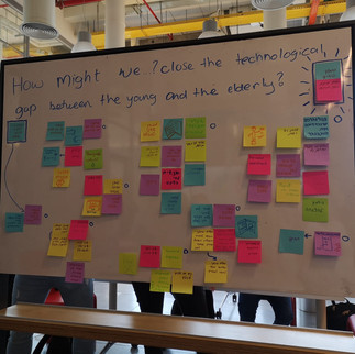 We started by placing on top of the board, our question of "How might we?". We chose to focus on "How might we close the technological gap between the young and the elderly?"